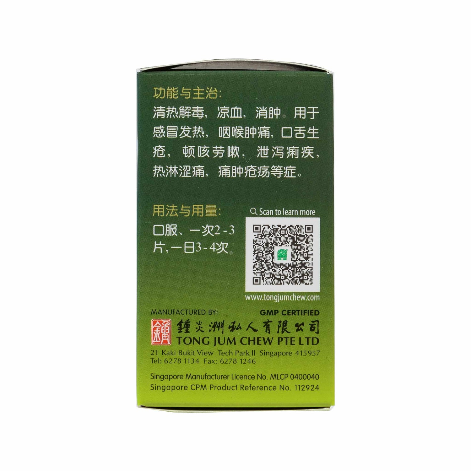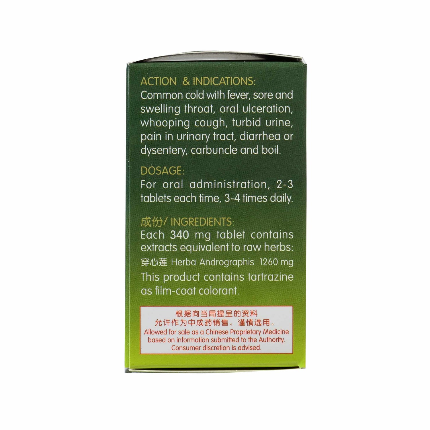 For common cold with fever, sore and swelling throat, oral ulceration, whopping cough, turbid urine, pain in urinary tract, diarrhea or dysentery, carbuncle and boil.