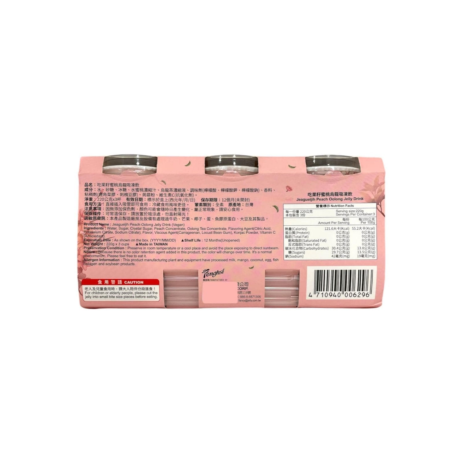 Indulge in the refreshing fusion of flavours with the Peach Oolong Jelly Drink. Combining the floral elegance of oolong tea with the sweet, juicy taste of ripe peaches, this drink offers a perfectly balanced blend of fruity sweetness and soothing tea notes. Infused with chewy jelly pieces, each sip delivers a delightful texture and burst of flavour. Conveniently packaged in a set of three, this drink is perfect for on-the-go enjoyment, offering a unique and enjoyable experience for tea and fruit lovers alike. Whether you’re looking for a refreshing pick-me-up or a flavorful treat, Peach Oolong Jelly Drink is a must-try for anyone seeking a deliciously fun beverage.