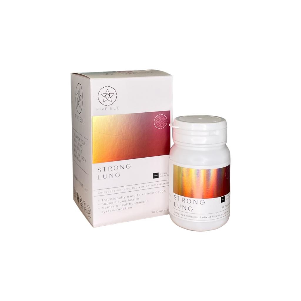 FIVE ELE Strong Lung is a potent blend crafted to support respiratory health and boost immune function. Infused with Cordyceps militaris and Radix et Rhizoma Asteris, this supplement effectively relieves cough, enhances lung health, and fortifies the immune system.