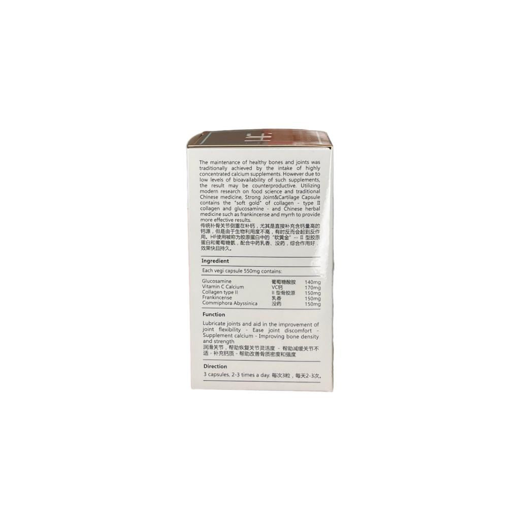 Introducing HF Strong Joint & Cartilage Capsule, a breakthrough formula fortified with patent type II collagen that minimizes the loss of calcium, offering direct support to cartilage and joints. Traditionally, maintaining healthy bones and joints relied heavily on calcium supplementation, yet the low bioavailability of such supplements often yields counterproductive results. Drawing from advancements in food science and traditional Chinese medicine, our capsules combine the "soft gold of collagen" - type II collagen and glucosamine - with Chinese herbal essences like frankincense and myrrh, ensuring comprehensive support for joint health.