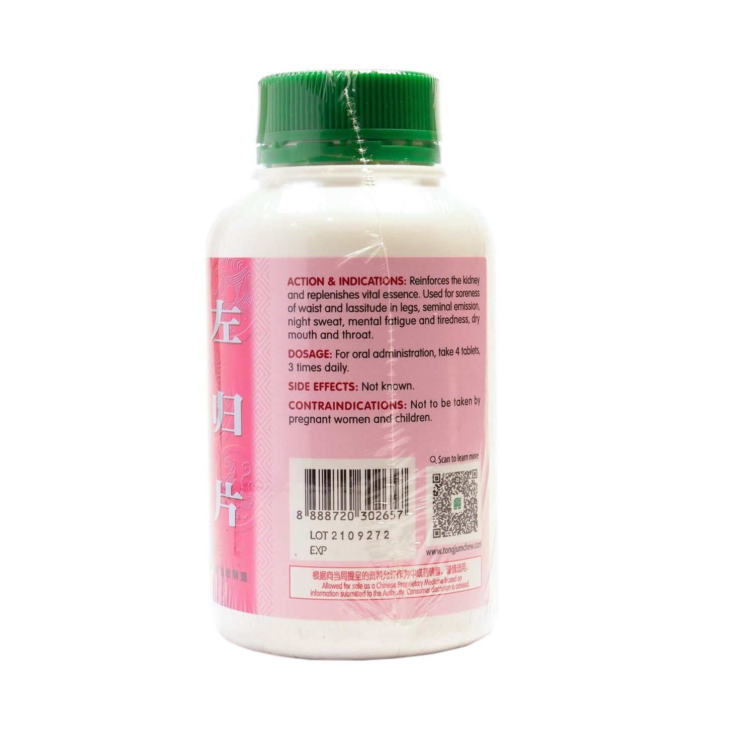 Reinforces the kidney and replenishes vital essence. Used for soreness of waist and lassitude in legs, seminal emission, night sweat, mental fatigue and tiredness, dry mouth and throat.