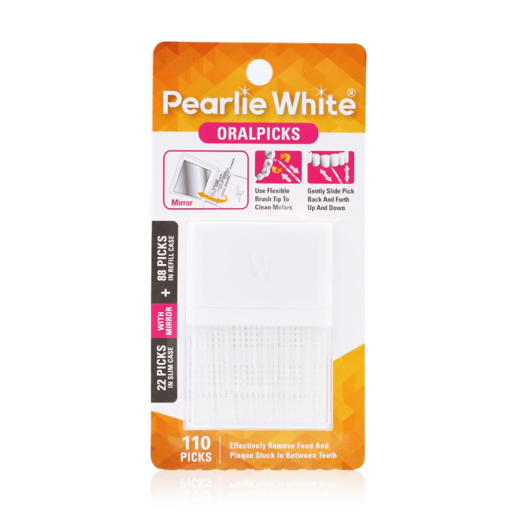 Oral Picks come in two convenient containers: a compact, refillable case that holds 20 picks, perfect for carrying in your pocket and equipped with a flip-out mirror for on-the-go touch-ups, and a larger container that holds 90 picks for convenient storage at home.